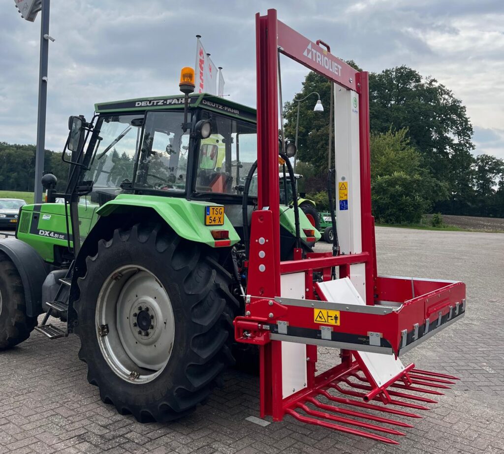 Deze nieuwe kuilvoersnijder is rechtstreeks uit de voorkoopbestelling van Trioliet door ons geleverd aan een melkveehouder uit Buurse. Op de kuilvoersnijder is een mechanische afschuiver gemonteerd.